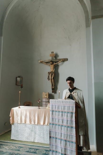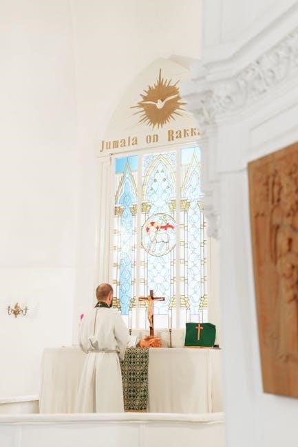The “O Sacrament Most Holy” PDF profoundly explores the Eucharistic theology, highlighting the Real Presence of Christ in the Sacrament of the Altar. It emphasizes the transformative power of the Eucharist, where bread and wine become the Body and Blood of Christ through transubstantiation. The hymn’s lyrics reflect a deep reverence for the sacrifice of the Mass, underscoring its role in uniting believers with God. The PDF resource delves into the theological richness of the Eucharist as a source of spiritual nourishment and divine grace. It also explores the Eucharist’s role in fostering communal worship and its significance as a sacrament of love and redemption. The resource serves as a valuable tool for deepening understanding and devotion to the Eucharistic mystery.